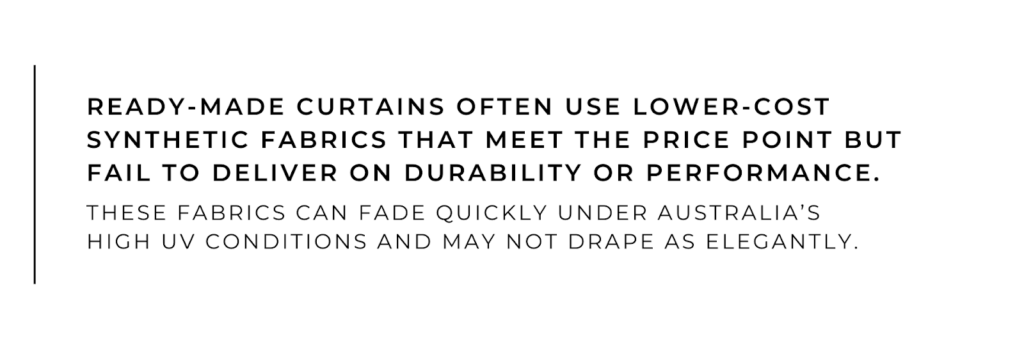 Ready-made curtains often use lower-cost synthetic fabrics that meet the price point but fail to deliver on durability or performance. These fabrics can fade quickly under Australia’s high UV conditions and may not drape as elegantly. In contrast, local manufacturers work with premium fabric houses such as Warwick, James Dunlop, Mokum, Hoad, and Zepel. These suppliers produce textiles specifically suited to the Australian climate, with superior fade resistance, stronger weaves, and a choice of natural fibres.