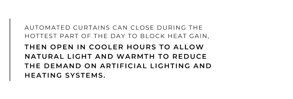 In winter, the same system can open curtains during daylight hours to let in natural heat, then close at dusk to trap warmth. This approach aligns with Passive House design principles that prioritise passive solar gain and heat retention through controlled shading.
