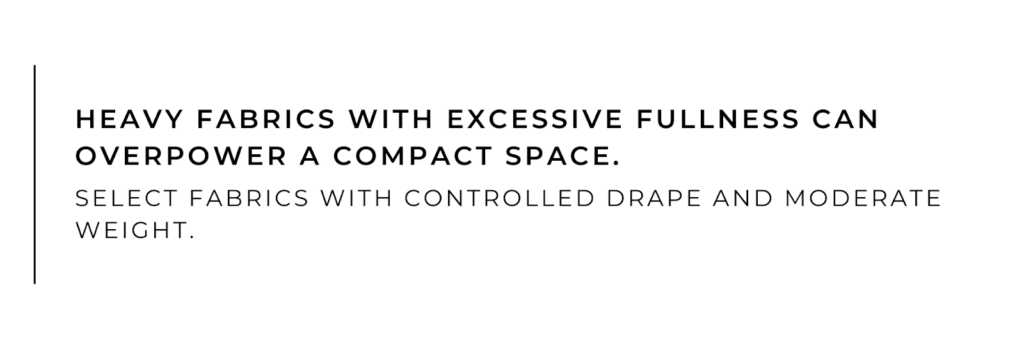 Heavy fabrics with excessive fullness can overpower a compact space. Select fabrics with controlled drape and moderate weight. Sheers often work well in these settings because they soften light without adding visual bulk.
