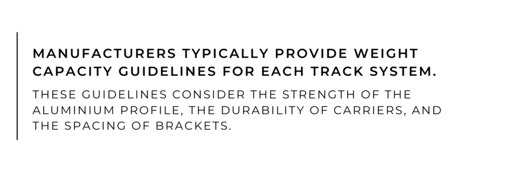 Manufacturers typically provide weight capacity guidelines for each track system. These guidelines consider the strength of the aluminium profile, the durability of carriers, and the spacing of brackets.